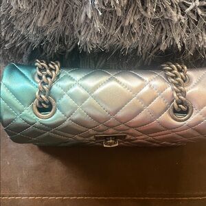 Stylish metallic quilted design. Chain strap. Secure lock closure.