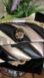 Stylish handbag with black and gold diagonal stripes. Features a gold chain strap and unique emblem.