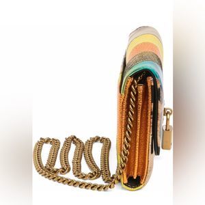 Vibrant striped design. Features gold lock detail. Includes chain strap.