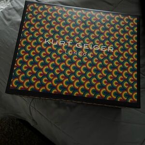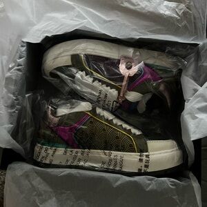 The Southbank Tag sneaker features an olive green upper with blue rainbow print across the sides. There is multi-colour metallic laminated pebble grain cow leather panels across the shoe as well as tag with antiqued brass eagle head.