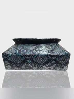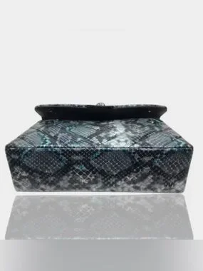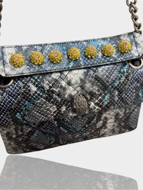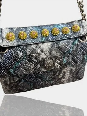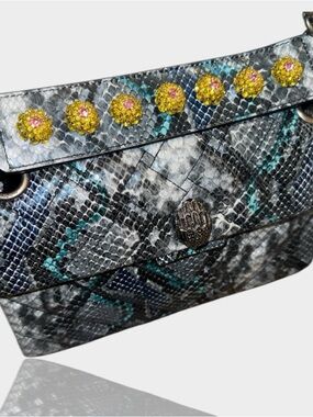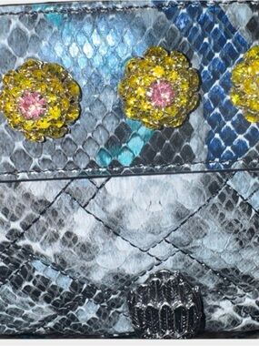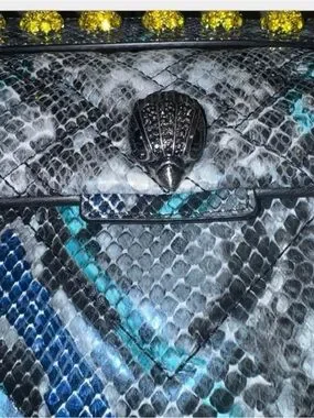 The Soft Kensington Purse is crafted from a soft leather with snake printed exterior in blues. The antiqued silver eagle head sits on the front flap.
