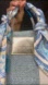 The Small Southbank Tote is crafted in a pale blue woven fabric with bone trims. There are metallic trims as well as an antiqued brass eagle head with crystals on the tab.