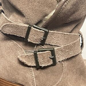 Features: Genuine suede ankle boot with double strap and double buckle ankle.