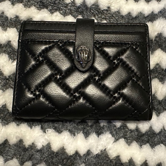Buttery SOFT quilted Kurt Geiger black wallet. Leather exterior, crystal bird head snap closure, two card slots on front, two on back and four on the inside. Measures Approx. 6.69'' W x 3.30'' H x 0.39''. Excellent condition, used maybe once. Smoke free home, all sales final. I record packing and shipping for your protection.