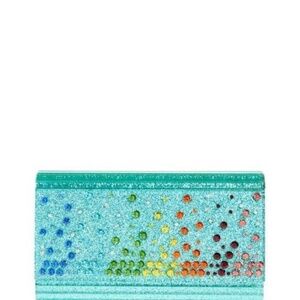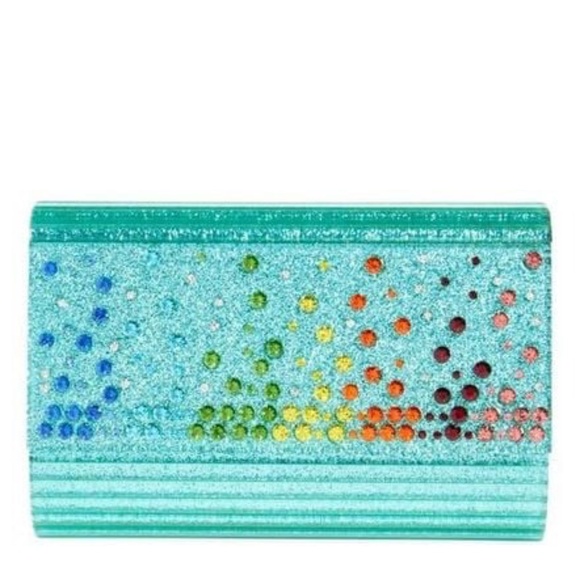 Light up any ensemble with this glittery clutch enhanced with rainbow crystals and topped with a removable crossbody chain.
