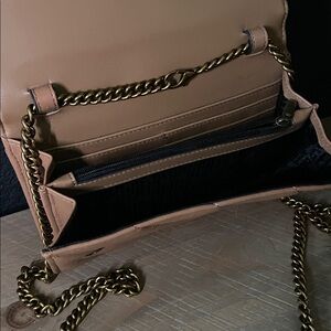 Beige Leather. Crossbody or Clutch. Inside Zipper Pocket. Card Slots. Back Pocket. Size: Height 5” Wide 8”