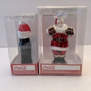 Here is a pair of Kurt S Adler Coca Cooa Christmas Ornaments Santa and Coke Bottle in fine condition with no damage. From 2009 and 2010