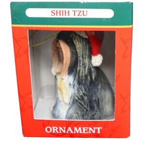 From Kurt and Adler is this black and white ceramic Shih Tzu ornament. The Shih Tzu is in a sitting position and is attired in a red and white Santa hat. There is a gold braided hanger. The ornament measures 3 inches high.