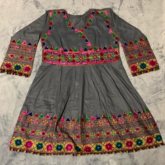 The vintage-style frock is making a huge comeback in Pakistani fashion. This grey frock with multi colored embroidery, colorful tassels and rhinestones makes a huge statement about how trendy you are. Breathable cotton makes it perfect for summer. Perfect for dawats or even outdoor events.