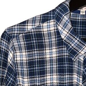 Navy, light blue and white plaid pattern with snap front closure, snap cuffs and roll tab sleeves.