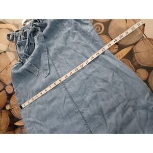 Kut From The Kloth Denim Chambray Pockets Halter Mini Dress Size 10, in good pre-owned condition: no holes, no stains, on seam pockets, minor wear, has been recently cleaned, may be stale from storage. Marked as a women's size 10, measurements are taken while laying flat and are approximate: (see photos)