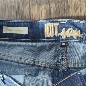 Kut From The Kloth Farrah Repurposed Denim Jean Pencil Skirt Knee Length Size 10, in good pre-owned condition: no holes, no stains, moderate wear, has been recently cleaned, may be stale from storage. Marked as a women's size 10, measurements are taken while laying flat and are approximate: (see photos)