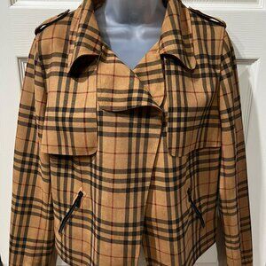 This stylish moto jacket combines classic plaid with a modern asymmetrical design. Its versatile tan color pairs effortlessly with casual and semi-formal outfits.