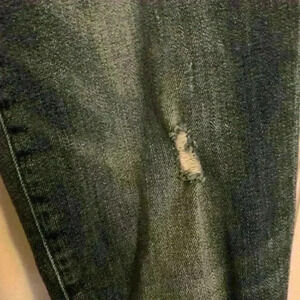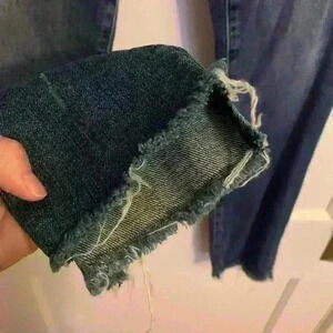 Jeans have a medium wash with raw hem ankles and distressing as shown in pictures.