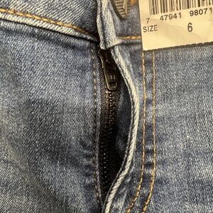 Color: Medium wash blue with whiskering and gentle distressed details on front