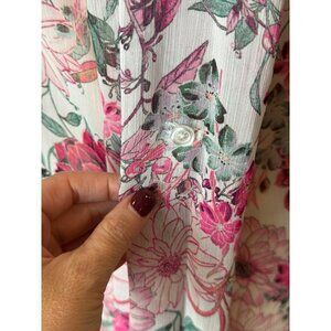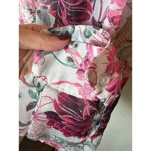 designer, chiffon, silky, flowy, lightweight, floral, flower, sheer, slightly sheer, colorful, casual, classic, classy, blouse cool, comfortable, comfort, comfy, cozy, vacation, travel, cruise, europe, beachy, beach, chic, trendy, stylish, sophisticated, elegant, boho, bohemian, festival, peasant, hippie, cottagecore, whimsical, dainty, romantic, roll-tab, Size 0, Size 2, extra small,