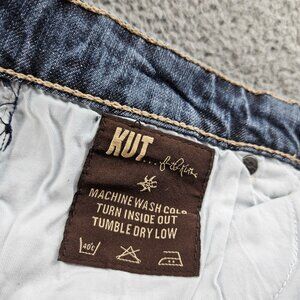 Classic five-pocket styling with tan contrast stitching and embroidered KUT logo on waistband