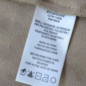 Good used condition, with no stains or tears. A tan/light brown faux suede jacket. Has an open draped front, pockets and cuff snaps. The vintage-inspired floral print adds an interesting contrast to the modern cut.