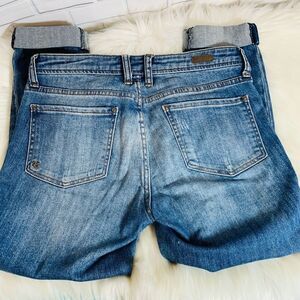 These are super comfy, with a busted right knee. Measures 16" laid flat at waist, 9" rise, and inseam of 24" with hem rolled as shown in photo. In very good pre-owned condition. Normal wear and tear noted, but no flaws or damage. Please review pictures and feel free to ask any questions or for more pictures prior to purchasing.
