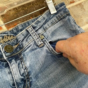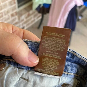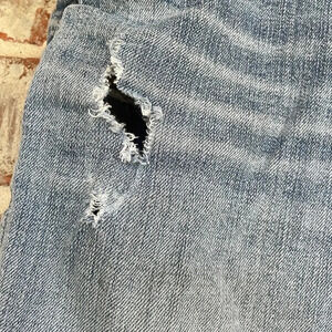 Distressed with raw cuffs and a tear in right front that has nothing behind it