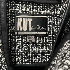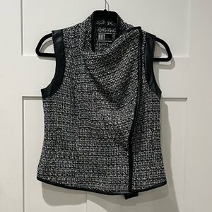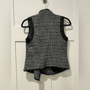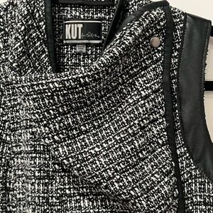 Kut From the Kloth tweed vest with faux leather trim. Has two snaps. One near the top and one near the bottom. Can be worn open and flowy or reserved and buttoned up.