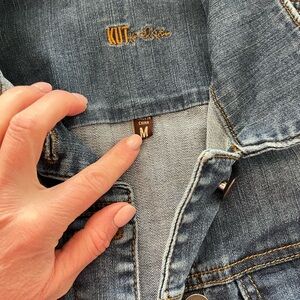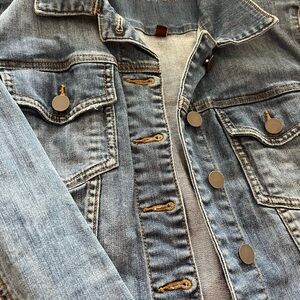 Trendy blue denim jacket with button closure. Features front pockets and classic stitching. Designed in our soft cotton denim with a touch of stretch. In great condition. Smoke free home.