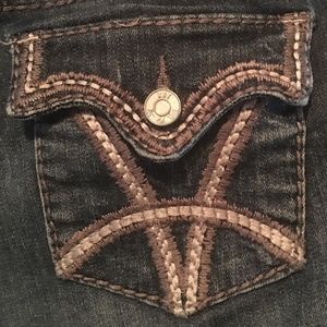 -5-pocket design (back pockets are flap pockets with stitching design) - One front pocket has scoop pocket w/ flap squared pocket inside & stitching (see picture) - Slight whiskering in front - Dark wash - Zipper fly, button closure