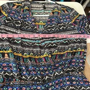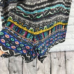 This super cute romper is pre-owned in excellent condition and features a wrap-style front, elastic waist, and very short shorts. The patterns alternate between a black and white tribal in a multicolored decorative design featuring blue, yellow, pink, and a teal-like blue with white background.