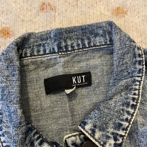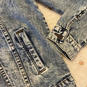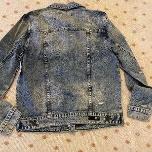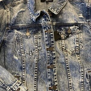 Stylish denim jacket. Classic button-up design. Distressed details for a trendy look. Perfect for casual wear.