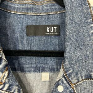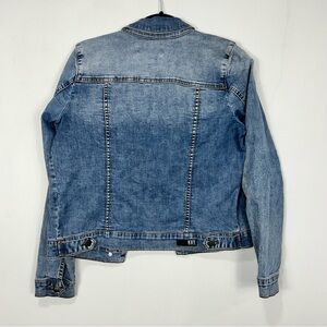 Classic blue jean jacket. Features button front and chest pockets. Stylish and versatile.