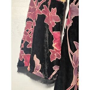 Black thin velvet dress with cut out sheer floral patterns in reds and purples, Fringed mesh around the neckline and the bottoms of the sleeves zip up back with hook and button closure. Sheer lining with adjustable spaghetti straps for a great fit! No flaws. Thank you for looking, I always ship fast!