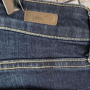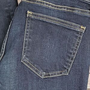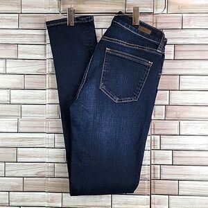 Cotton rayon polyester spandex blend darkwash blue denim jeans by Kut in a mid-rise skinny style with gold stitching and manufacturer fading. Great pre-owned condition.