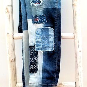 Kut from the Kloth Catherine boyfriend style midrise jeans. Hand embellished, patched & embroidered in sashiko / boro style slow stitching on front legs. Patch fabrics include vintage kimono silks, shibori dyed denim, and various cotton prints. Base jeans distressed, color blocked indigo denim in light-to-dark wash shades on front & back of jeans.