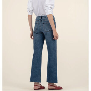 A fresh take on vintage-inspired denim, the Kut from the Kloth Meg jeans feature a flattering high-rise waist and a relaxed wide-leg silhouette. Made from soft stretch denim with a classic medium wash, these jeans offer comfort, versatility, and timeless style. The raw hem adds an effortless, modern touch—perfect for pairing with sneakers, boots, or sandals.