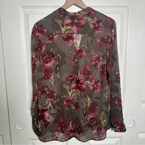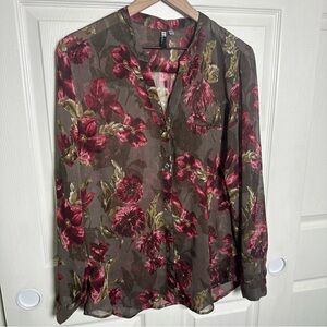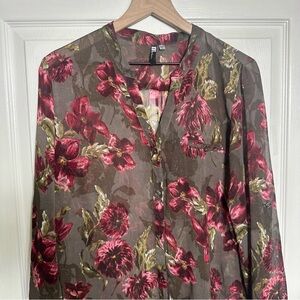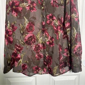 The Kut From The Kloth Shirt is a women's large floral button-up blouse made of sheer polyester mesh fabric in a vibrant red/brown color. It features a V-neckline, long sleeves with casual sleeve type, and button closure. This versatile top is perfect for various occasions such as casual, formal, workwear, or parties, making it a stylish and lightweight option for all seasons. With a nature-themed design and accents, this sheer blouse from the KUT from the Kloth brand offers a touch of preppy and colorful style to the wearer's wardrobe. Optional roll up sleeves