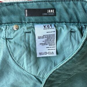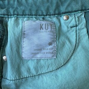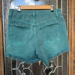 Stylish teal jean shorts with frayed edges. Ideal for casual outings. Features subtle distressing.