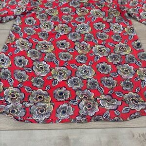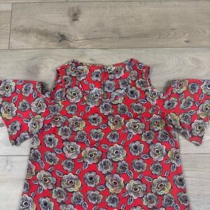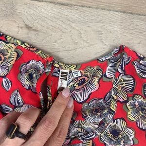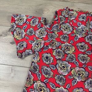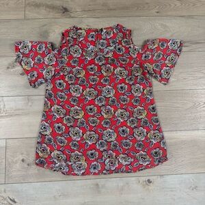 Kut from the Kloth women’s floral cold shoulder, short sleeve blouse. Lightweight, flowy material style with cut outs on shoulders and flare short sleeve. Keyhole button closure on back of neck. Color is a vibrant bright red with flowers in navy blue, pink, yellow, and green. Excellent like new condition, no flaws.