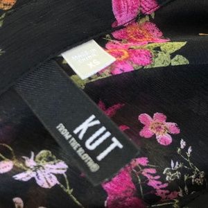 Kut from the Kloth Women's Blouse size XS Extra Small Black in color, sexy sheer. Rose floral print design throughout. Hidden button front with pleated back. Cut out opening on upper chest and down each sleeve. 100% Polyester. KT66006 Machine washable. Pit to pit measures 19.5", back bottom of collar to bottom of shirt 27.5". Great preowned condition with no rips or stains.