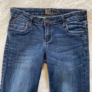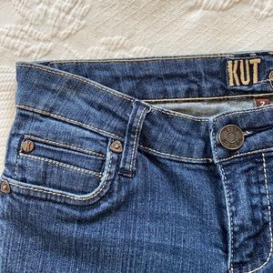 Kut from the Kloth jeans, embroidered back pockets detail, size 2. In GUC, minor signs of wear, no major flaws. Interesting embroidered back pockets detail. Overall dark blue color.