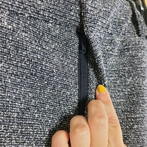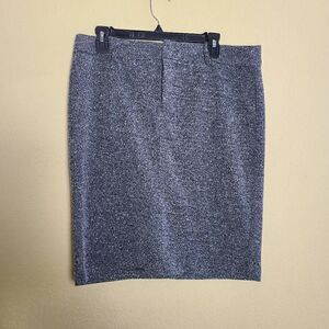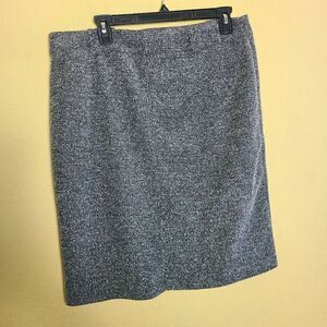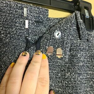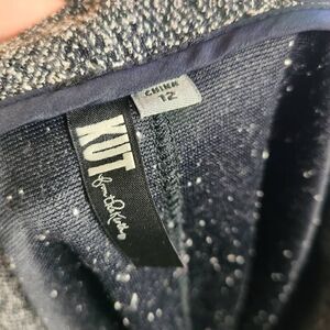 This is a tweed look skirt by Kut From The Kloth. The style name is Marley. This skirt is grey and white, and has a zipper and dual clasp fly with a hidden inner button.