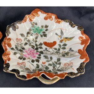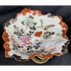 Hand Painted with bird and floral design, featuring Chrysanthemums, Peonies and Dahlias Gold Trim Leaf Shape