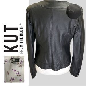 Kut from the Cloth Women’s Faux Leather Black Jacket. Snap front closure and pockets. Sleeves also have snaps at the cuff. Cute floral lining.