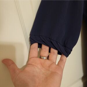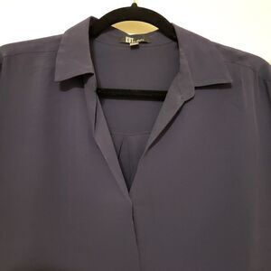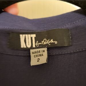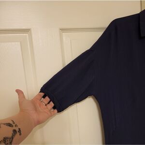 Kut from the Kloth navy collard t-shirt dress, size 2, slight snag in the fabric at back of hem (see pics), slightly high/low, hidden button at neckline, v-neck, cuffs are rolled, thin lightweight material, great condition.
