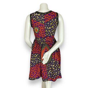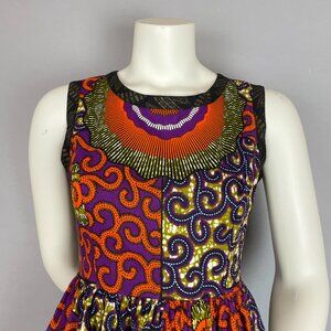 Vibrantly colorful African wax print dress in a fit and flare style. Sleeveless, round neck, and hidden pockets on the flared skirt.