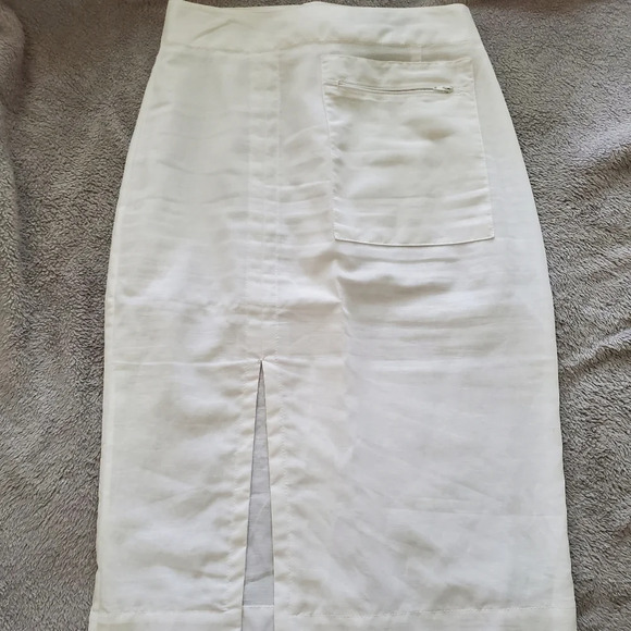 Elegant skirt, with back zipper closure and single button. Large zippered pocket in front with high slit on opposite side. Fabric is very thin as shown in pic. Absolutely loved this skirt! European size 34 equates to approximately 0.