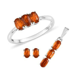 Natural Tangerine Kyanite 3 Piece Set. 3 Stone Ring & Pendant With Stud Earrings. In Platinum Over 925 Sterling Silver.