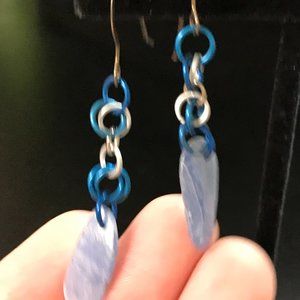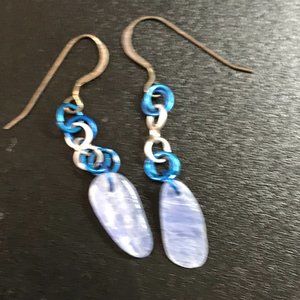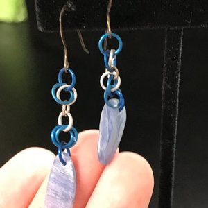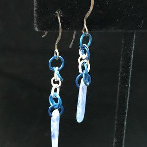 These dangle earrings feature Kyanite slivers and blue and silver chain mail links made out of anodized aluminum. The ear wire is a sterling silver fish hook.