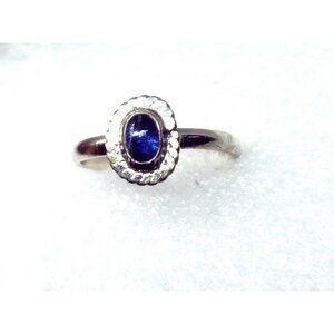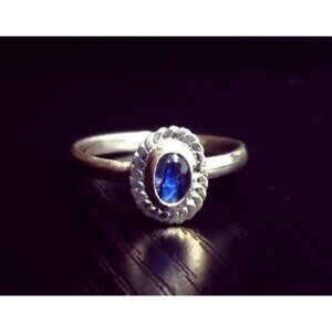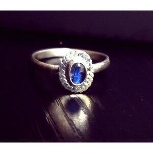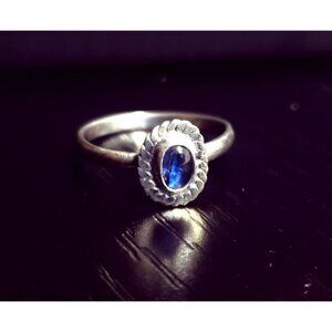 A handmade ring crafted by me using .925 solid sterling silver. Stone within this ring is a round blue kyanite cabochon stone showing an array of flashes within the stone. Encasing the stone is a beautiful braid pattern.
