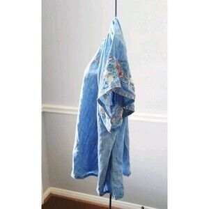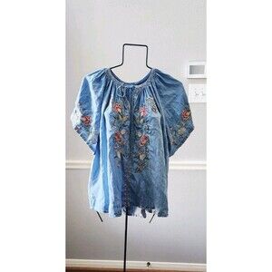 The Kyla Seo Embroidered Betty Denim Shirt in XL features a beautiful floral pattern with embroidered accents, adding a boho touch to the classic western-inspired top. Made of tencil fabric with a relaxed fit, this blue button-down blouse is perfect for women looking for a stylish and comfortable option. The drawstring closure and short sleeves make it easy to wear for various occasions, showcasing the brand's attention to detail and quality craftsmanship.