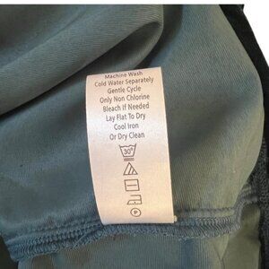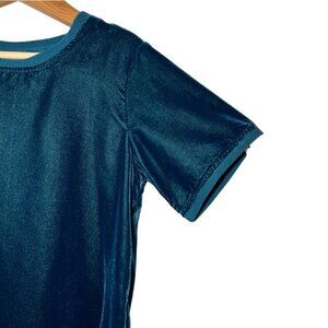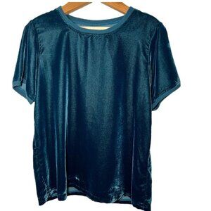 Incredibly soft. Deep turquoise/emerald color with a slightly metallic sheen. Size large. No flaws like new.
